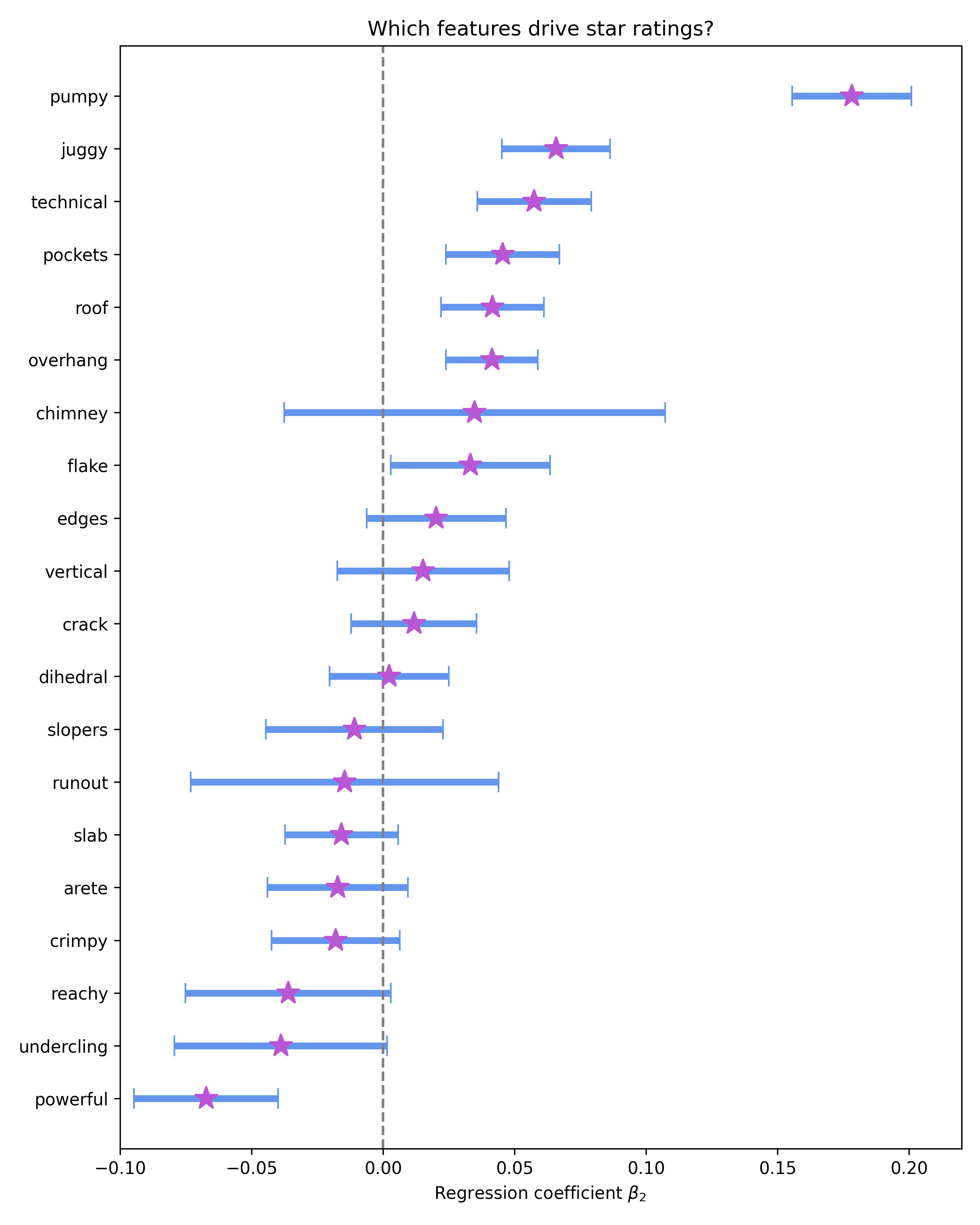 The figure below shows the estimated regression coefficients for route features that have the largest estimated effect on star ratings as purple stars, while the blue band shows the 95% confidence intervals. Positive coefficients correspond features associated with higher average star rating, while negative coefficients indicate features associated with lower ratings.